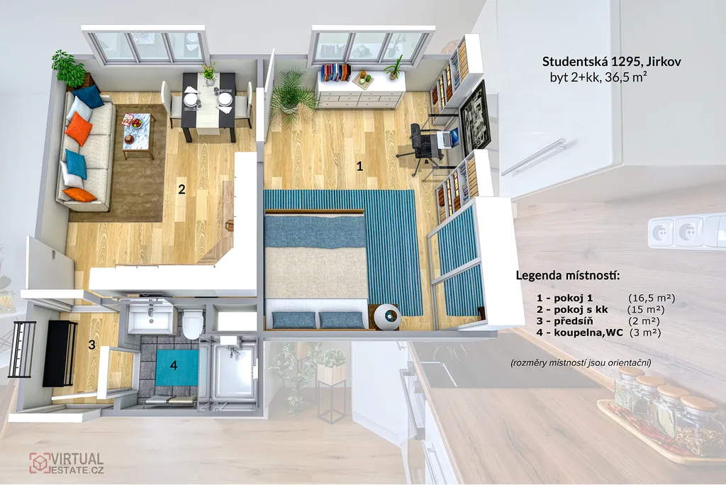 Nabízíme k dlouhodobému pronájmu světlý byt 1+1 o rozloze 35,7 m² na adrese Studentská 1295, Jirkov ve 3. patře zatepleného panelového domu bez výtahu v klidné lokalitě. Je možné si ho zařídit jako 2+kk, protože do kuchyně se bez problémů vejde gauč a na protější stranu třeba televize. Nebo můžete mít v kuchyni prostornou jídelnu či pracovní koutek.