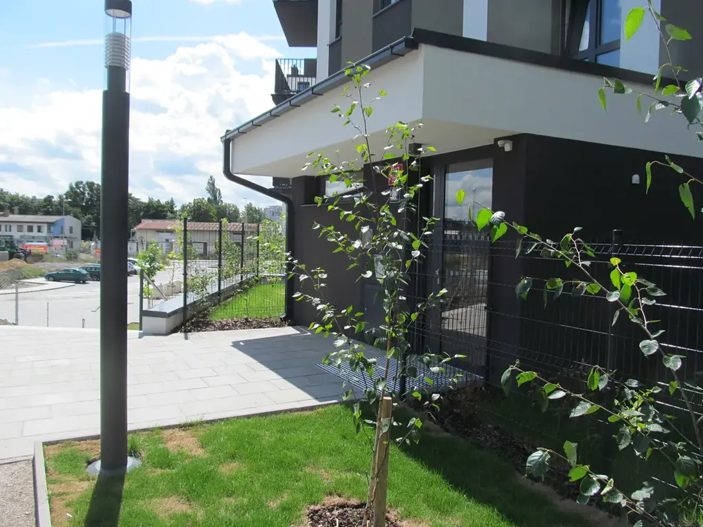 Jednotka o dispozici 3+kk a podl. ploše 77 m2, se zahrádkou s terasou o velikosti 20 m2 a možností podzemního garážového stání. Jednotka se skládá z předsíně, tří samostatných neprůchozích místností, z koupelny s vanou, samostatného WC, komory a předzahrádky 20 m2.