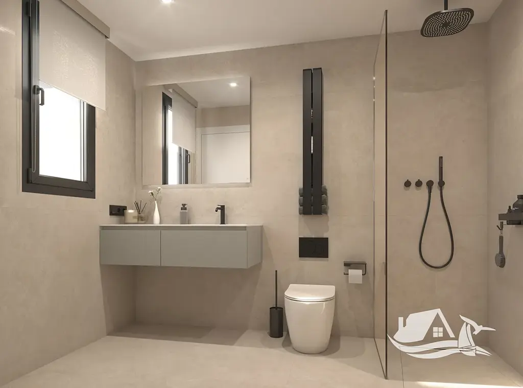 Interiér je navržen s důrazem na moderní styl a praktičnost. Porcelánové podlahy zajišťují snadnou údržbu, kuchyně je vybavena spotřebiči a vestavěné skříně poskytují dostatek úložného prostoru. Komfort doplňují elektrické rolety, videotelefon, podlahové vytápění v koupelně a předinstalace klimatizace.