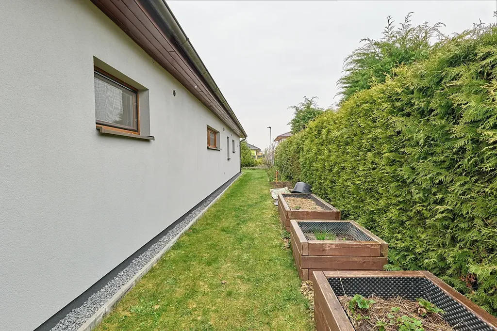 Prostorný dům stojí na skvělé adrese kousek od okraje Prahy ve směru na Brandýs nad Labem. Klidná obec, jejíž historie sahá až do 13. století nabízí skvělou dostupnost do hlavního města. Během několika minut dojedete na nájezdy dvou dálnic - první ve směru na Hradec Králové a druhou směrem na Mladou Boleslav. Samotný dům, jehož dispozici vidíte na půdorysu je dispozičně řešen jako 3KK a nabídne prostornou garáž. Rozlehlý obývací pokoj s kuchyní vybavenou vestavnými spotřebiči doplňuje světlý výklenek, ve kterém je situován jídelní stůl a vcházíme z něho na velkou terasu. Tento výklenek (zimní zahradu), lze případně zcela oddělit a vytvořit tak další samostatnou místnost. Terasa je vybavena moderním hliníkovým zastřešením, které je vybaveno dálkovým ovládáním, jímž lze stáhnout boční stěnu a dále stínění, aby vám zde bylo příjemně i v horkých letních dnech. Dům je obklopen akorát velkou udržovanou zahradou, která disponuje zahradním domkem, houpačkou pro děti a vyvýšenými záhony. Komfortní vjezd na pozemek zajišťuje brána s ovladačem, elektrická vrata do garáže jsou samozřejmostí. Komfort zajišťují dvě koupelny, z nichž 1. disponuje sprchovým koutem a WC a druhá pak vanou a WC. Vytápění zajišťuje tepelné čerpadlo v kombinaci s podlahovým topením.