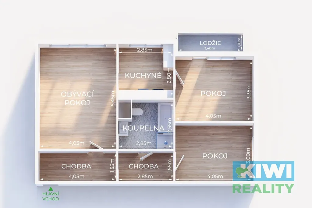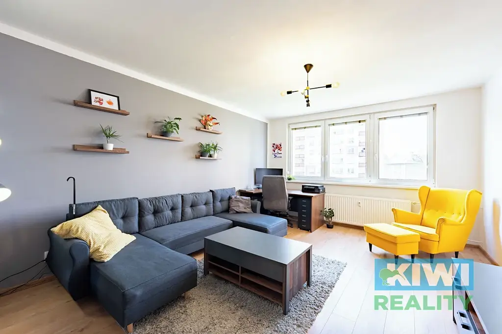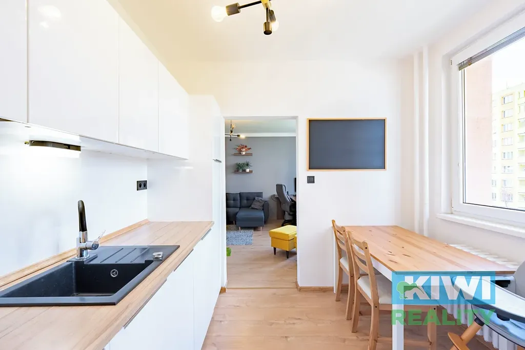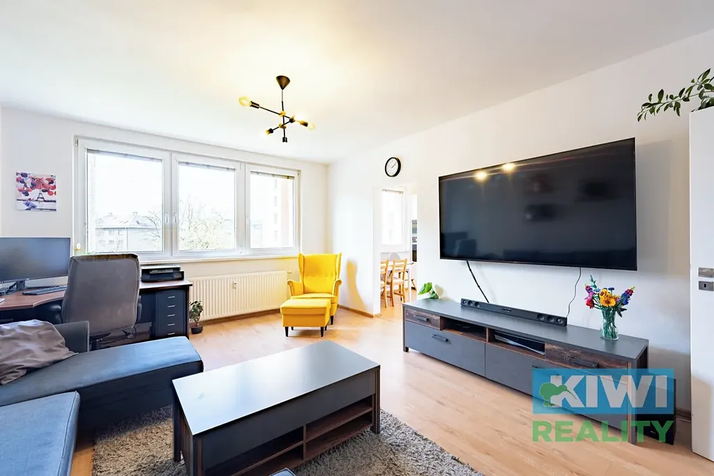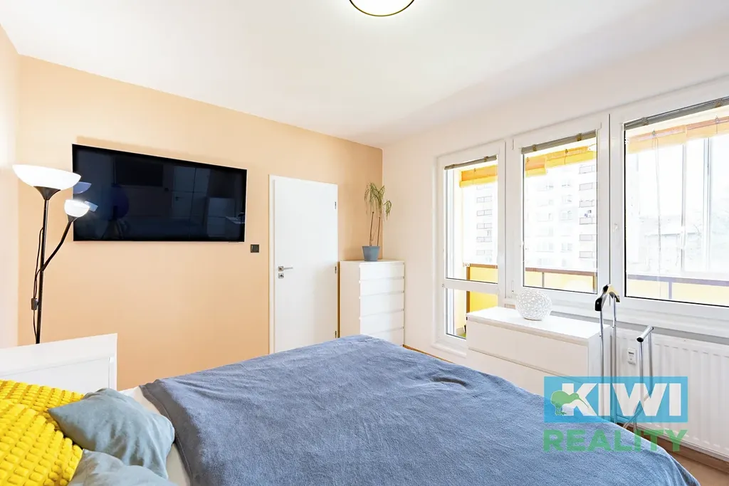 Dispozice bytu je velmi praktická. Po vstupu se ocitnete v prostorné chodbě, ze které vede vstup do samostatného dětského pokoje orientovaného na sever, dále do velké koupelny s WC, kde najdete jak vanu, tak sprchový kout a dostatek místa pro pračku i sušičku. Dominantou bytu je prostorný obývací pokoj, který je průchozí a nabízí dostatek místa nejen pro odpočinek, ale i pracovní kout nebo jídelní zónu. Přes kuchyň se dostanete do ložnice se zasklenou lodžií (cca 4 m²), ideální pro ranní kávu nebo relax. Obývací pokoj, kuchyně i ložnice jsou orientovány na západ, takže byt působí světlým a příjemným dojmem.
