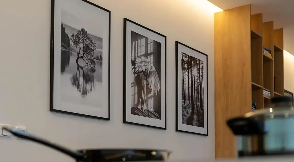 Byt je vybaven luxusní kuchyňskou linkou včetně všech spotřebičů značky Bosch (lednice, mražák, myčka, indukce s vnitřním odtahem, mikrovlná i horkovzdušná trouba), elegantním ostrůvkem na vaření, jídelním stolem a židlemi.