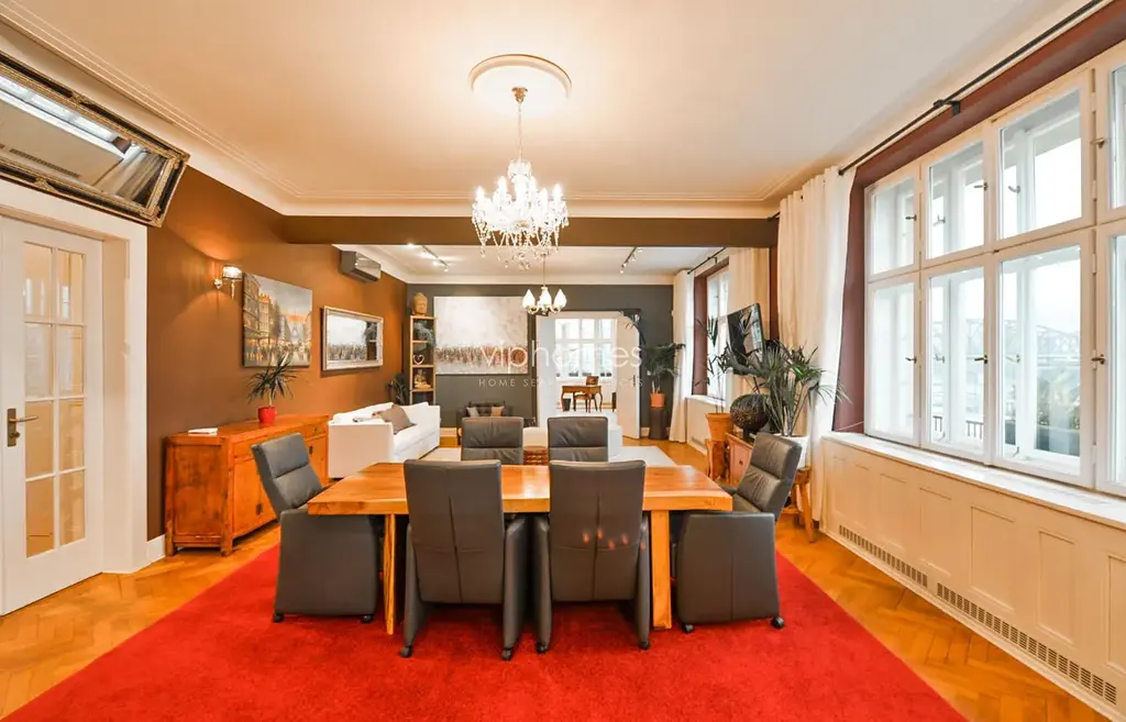 Elegantně zařízený byt s nádherným panoramatickým výhledem na řeku, Pražský hrad a Vyšehrad ocení milovníci historického centra Prahy. Byt je situován ve druhém nadzemním podlaží nově rekonstruované rezidenční budovy se zachovalými původními prvky.