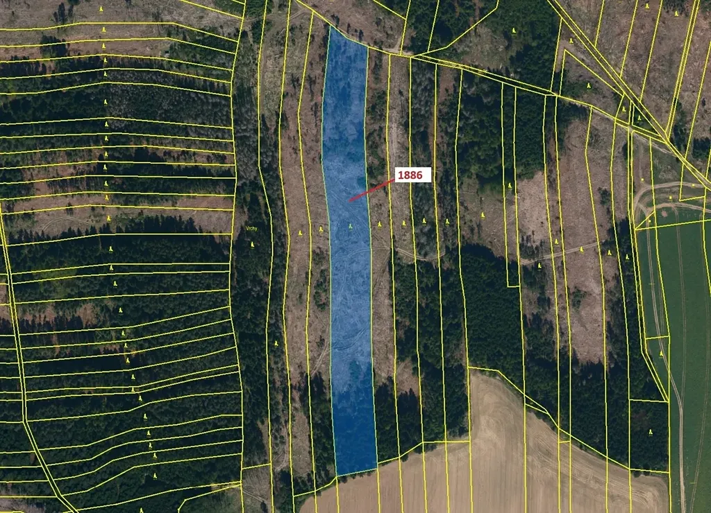 Lesní pozemek o výměře 19 314 m2, parcelní číslo 1886, podíl 1/1, katastrální území Štítné, obec Žirovnice, obec s rozšířenou působností Pelhřimov, okres Pelhřimov, Kraj Vysočina. Po těžbě.