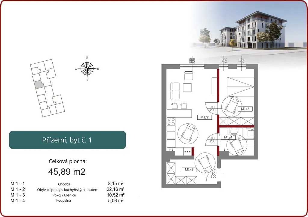 Hledáte byt se snadným přístupem a velkorysým prostorem? Byt M1 nabízí dominantní obývací pokoj s kuchyňským koutem (přes 22 m²) a samostatnou ložnici.
