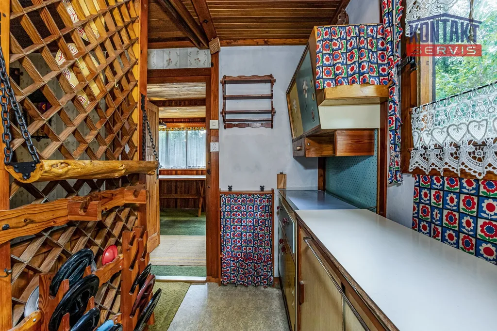 Interiér je laděn v tradičním chatařském stylu — barevný, funkční a s duší, což ocení především příznivci klasické rekreační estetiky.