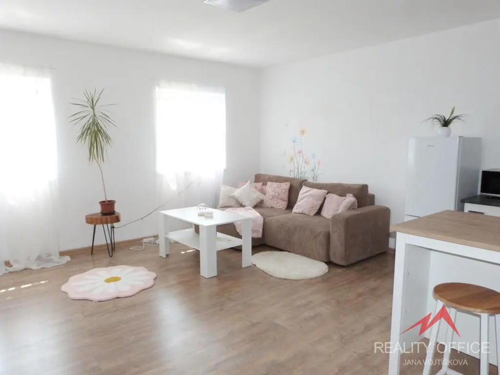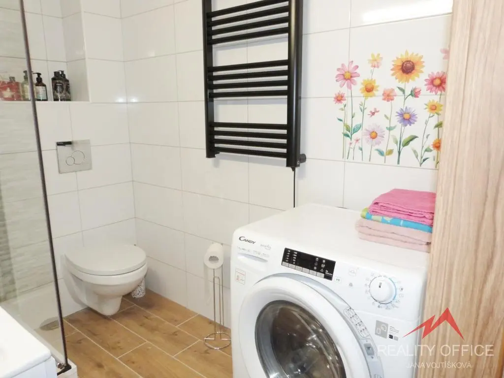 Nové vybavení: Kuchyňská linka je osazena novými vestavěnými spotřebiči. Koupelna je moderně řešena se sprchovým koutem a WC.
