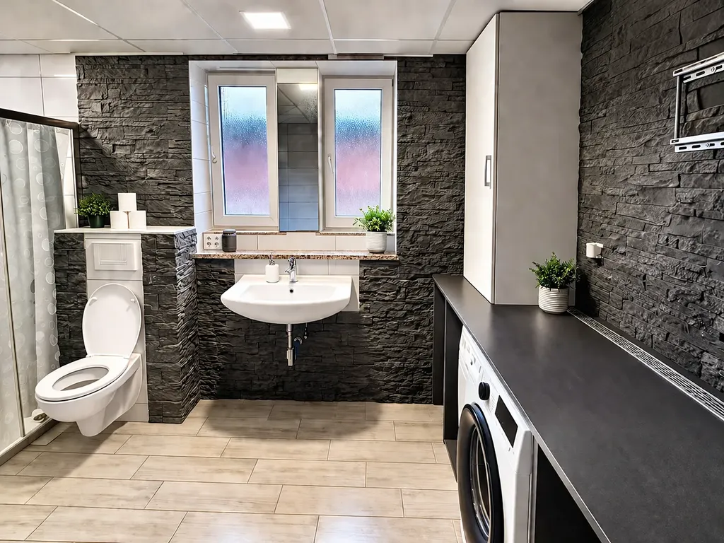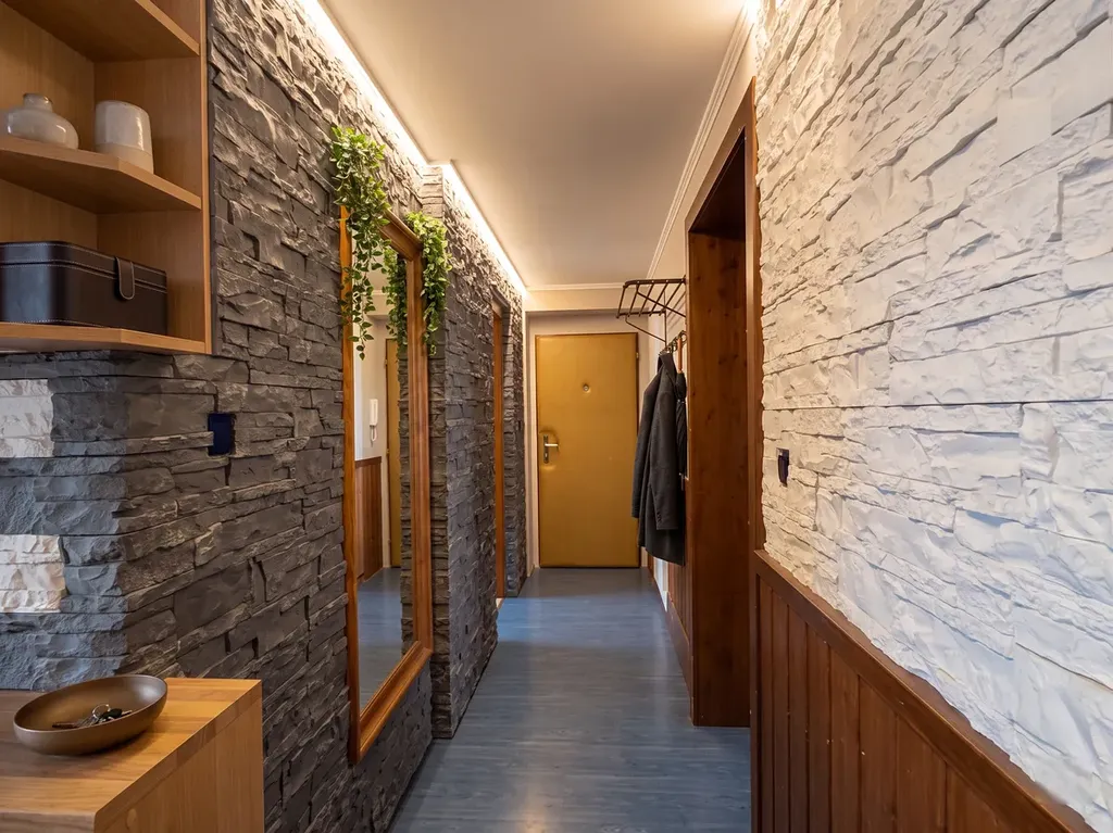 Dřevěné schodiště vede do druhého podlaží mezonetu, kde se nacházejí dva samostatné pokoje a další koupelna se sprchovým koutem. Toto uspořádání zajišťuje maximální soukromí a komfort i pro vícečlennou rodinu.