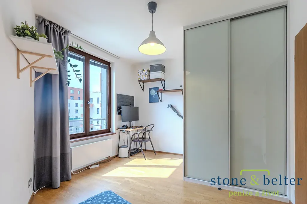 Srdcem bytu je prostorný obývací pokoj s kuchyňským koutem o ploše 34,2 m². Byt se pronajímá zařízený tak, jak je vidět na fotografiích, a je připravený k okamžitému nastěhování. Pohodu v letních měsících zajišťuje klimatizace ve všech místnostech.