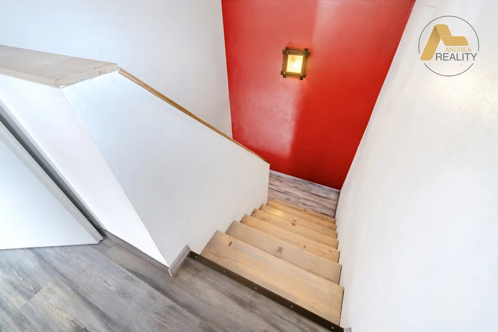 V patře jsou k dispozici tři samostatné pokoje (19 m², 19 m² a 15 m²), koupelna s toaletou (8 m²) a chodba se schodištěm. Vytápění je zde řešeno radiátory. Uvedené výměry jsou orientační.