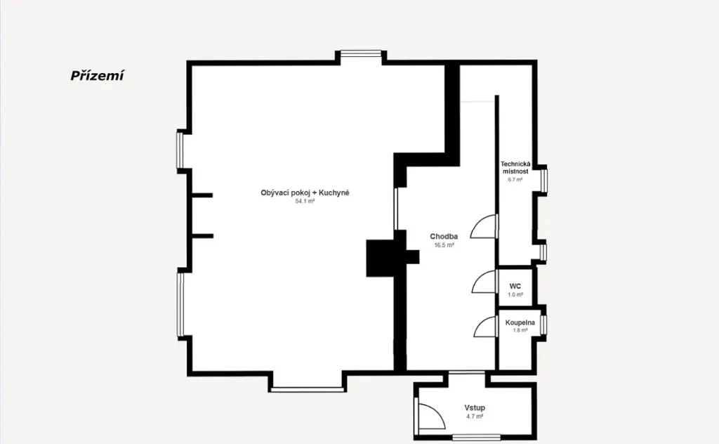 Dominantou přízemí je prostorný obývací pokoj s krbem a jídelnou (54 m²), na který plynule navazuje kuchyňský kout. Z obývacího prostoru je přímý vstup na venkovní posezení, ideální pro relaxaci i setkávání s rodinou a přáteli. V přízemí se dále nachází zádveří, hala se schodištěm (16m²), toaleta, koupelna a technická místnost . Samozřejmostí je podlahové vytápění.