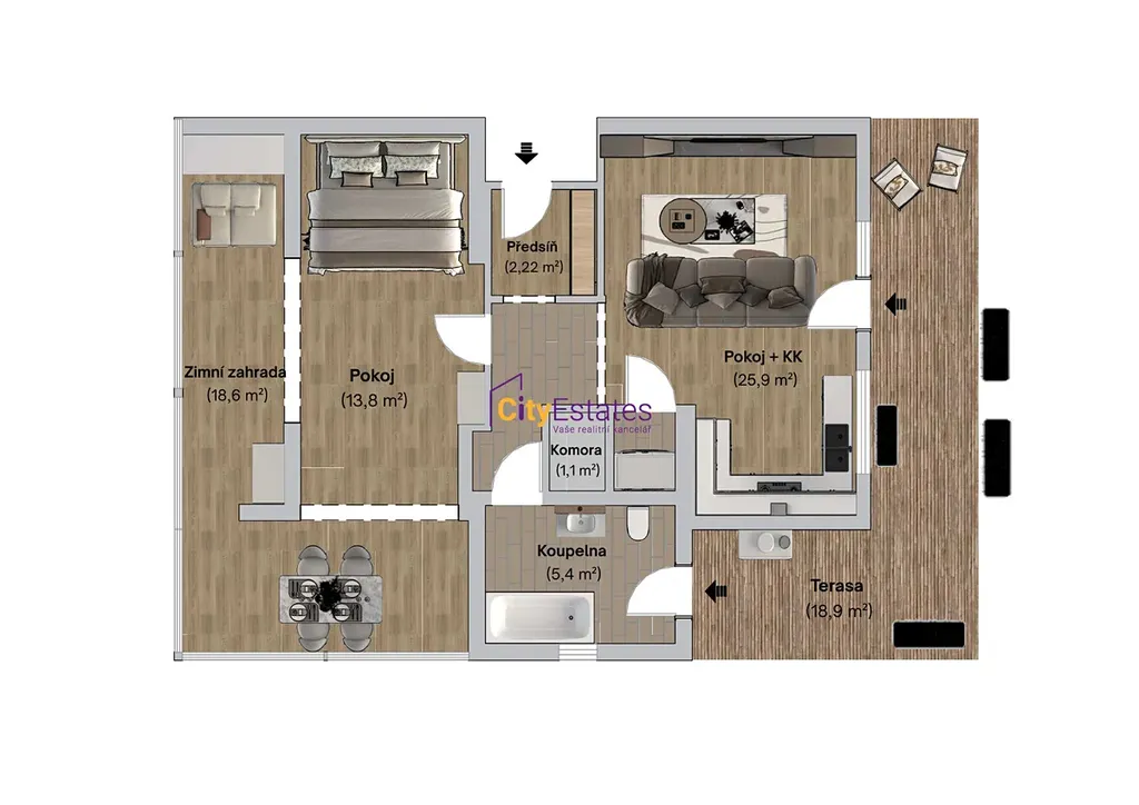 Tento byt je jako malý ráj pro ty, kteří mají rádi výhled a květiny – vychutnejte si terasu, kde se ve velkých květináčích rozvine vaše zahrada plná barev, a vnitřní prosklenou zimní zahradu, která je dokonale uzpůsobená pro teplomilné rostliny jako jsou například citrusy. S dostatkem slunce a světla zde vaši zelení přátelé budou vzkvétat celý rok!