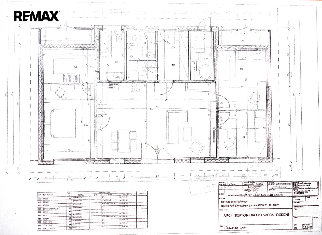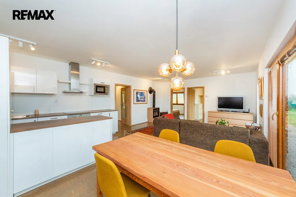 Dům je bungalov s velmi dobře využitým vnitřnmí prostorem a světlým interiérem. Dispozice je 4+kk, plánek najdete ve fotogalerii. Centrem domu je obýací pokoj s kuchyňským a jídelním koutem, ze kterého je výstup na terasu. Kromě 3 ložnic, z nichž jedna má vlastní šatnu a koupelnu, se zde nachází ještě další koupelna, komora a předsíň. Technická místnost je přístupná zvenku.