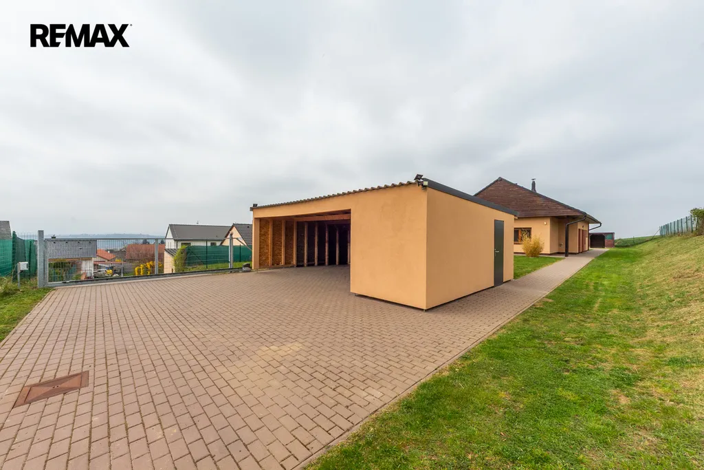 Na pozemku se nachází také zastřešené garážové stání pro dvě auta a místnost pro zahradní techniku.