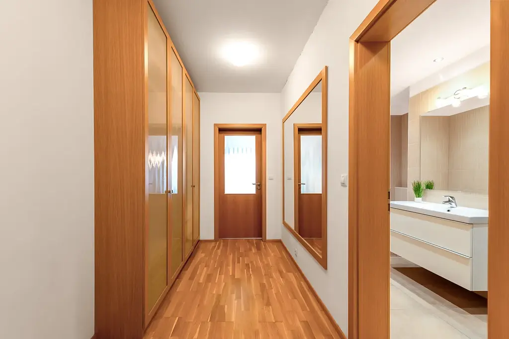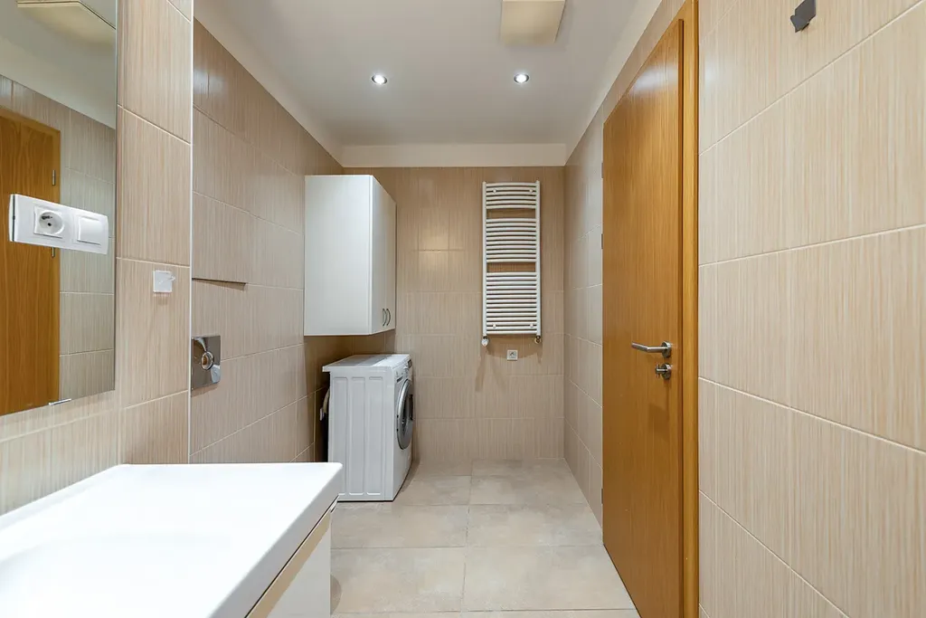 Byt je vybaven videotelefonem, bezpečnostními dveřmi a venkovními elektronicky ovládanými žaluziemi.