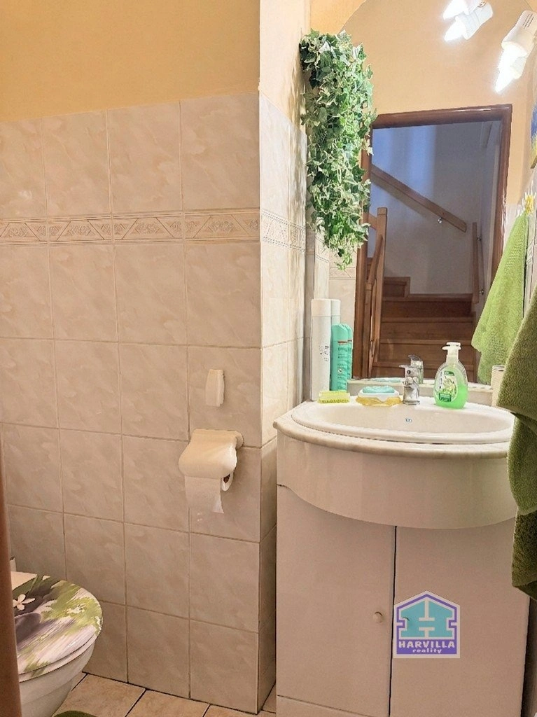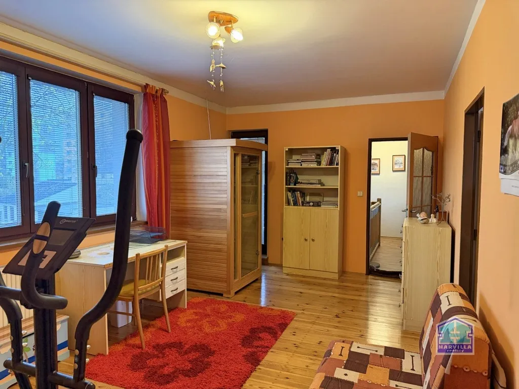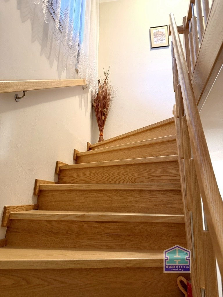 V přízemí domu se nachází zádveří, předsíň, kuchyně vybavená sporákem se sklokeramickou deskou a myčkou, velký obývací pokoj a samostatné WC s umyvadlem. Z kuchyně je možný vstup na zahradu, z předsíně se dostaneme dveřmi do první garáže s dílnou. Po dřevěných schodech z masivu se dostaneme do plnohodnotného patra, které disponuje chodbou se vstupem do koupelny s vanou a sprchovým koutem, na samostatné WC, dále do 5 pokojů a z jednoho z pokojů se dostaneme na balkón.