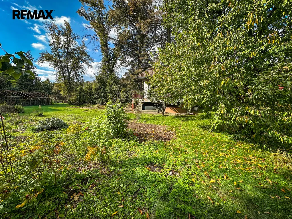Na udržované zahradě jsou vzrostlé ovocné stromy a keře.