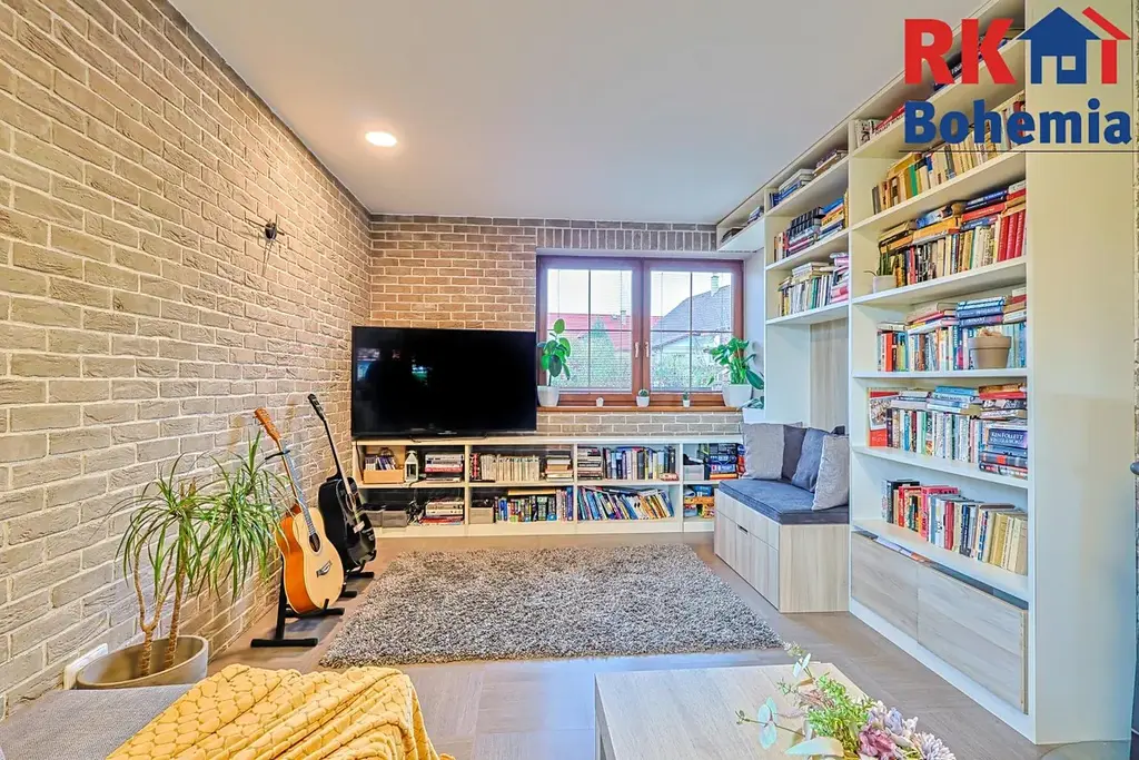 - Přízemí (1. NP): Srdcem domu je prosvětlený obývací pokoj s jídelnou (33 m2), kterému dominují krbová kamna a stylová vestavěná knihovna s čtecím koutkem. Dále zde najdete plně vybavenou kuchyni, technické zázemí, prádelnu, samostatné WC a přímý vstup do garáže.