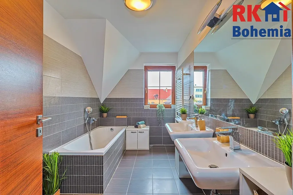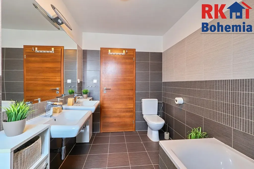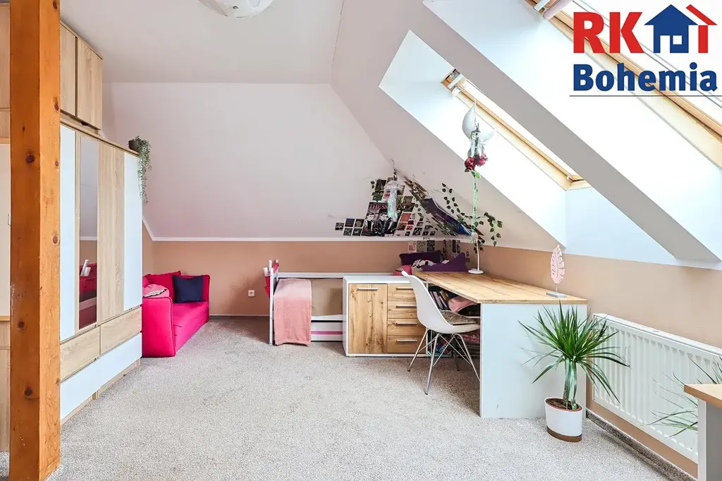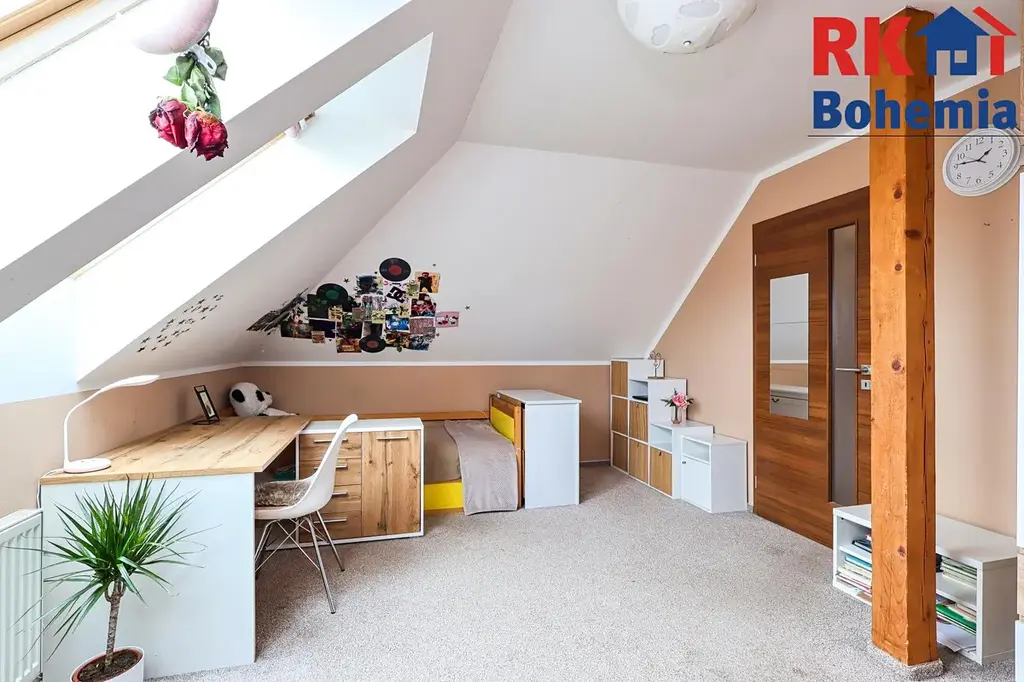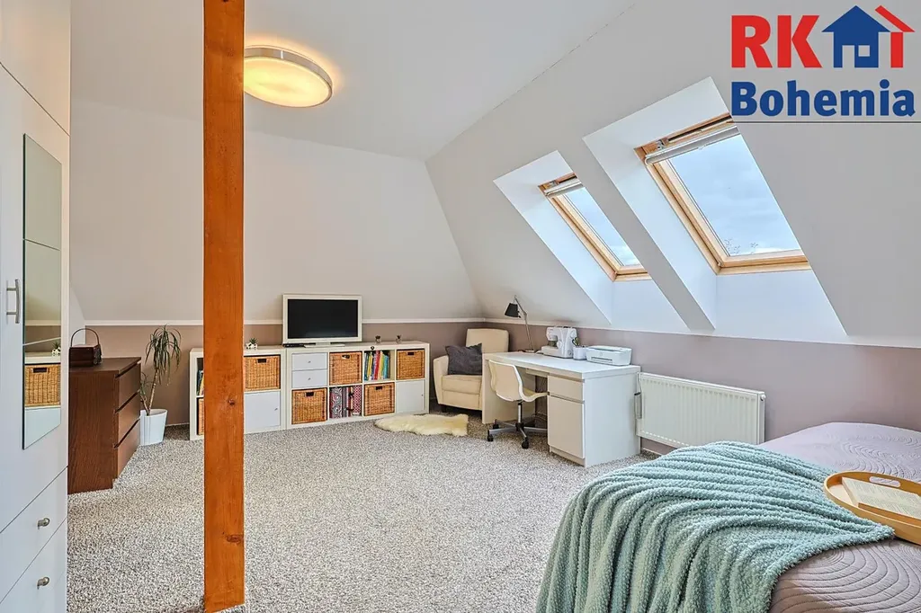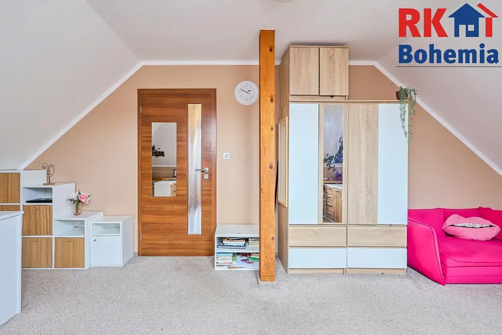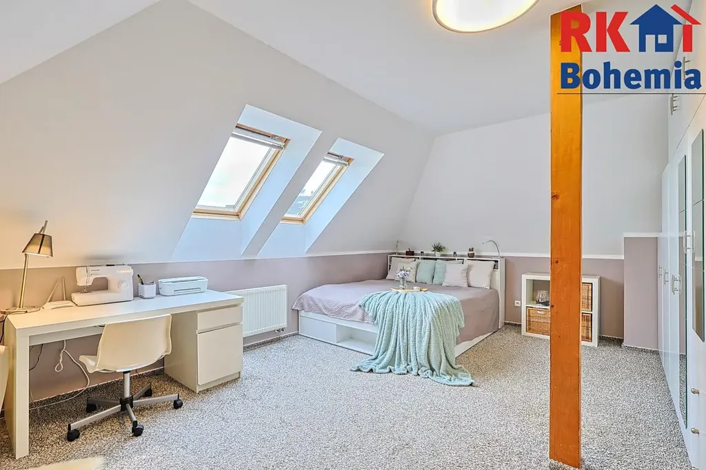 - Podkroví: Horní patro nabízí tři prostorné ložnice (největší má 25 m2) s vestavěnými skříněmi na míru. Koupelna je vybavena vanou, dvěma umyvadly a toaletou. K dispozici je i praktická šatna a výsuvný žebřík na půdu pro sezónní věci.