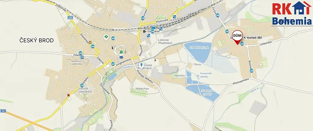 - Občanská vybavenost: Přímo v obci je školka, škola i hospůdka. Kompletní služby (supermarkety, lékaři, kultura) najdete v sousedním Českém Brodě, kam vás doveze pravidelný autobus PID.