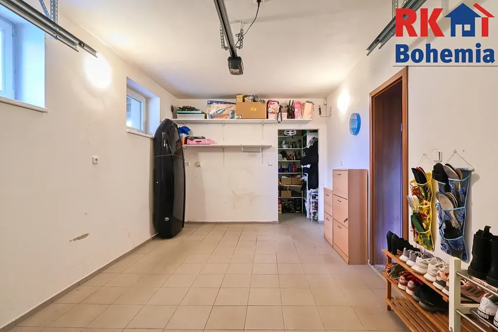 Prostorná garáž, která je propojena s domem dveřmi ze zádveří disponuje garážovými vraty na elektrický pohon. Kromě zděné garáže pro jeden vůz je součástí pozemku i venkovní kryté stání, které spolehlivě ochrání Váš druhý automobil před nepřízní počasí.