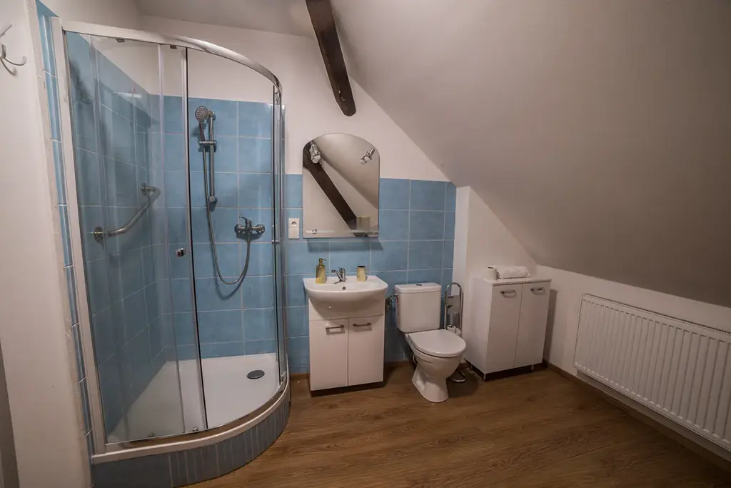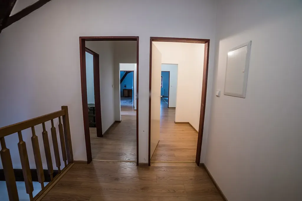 V podkroví mimo velké suché půdy, která slouží aktuálně jako sklad, je koupelna, a dva prostory k bydlení, které můžou sloužit jako samostatné prostorné byty.