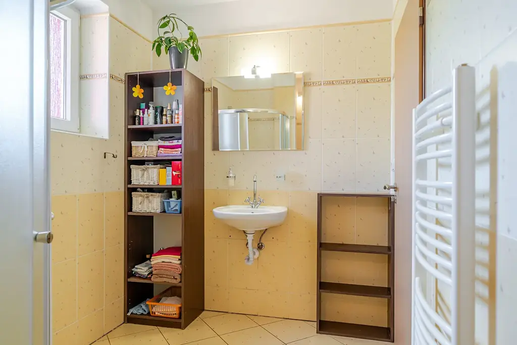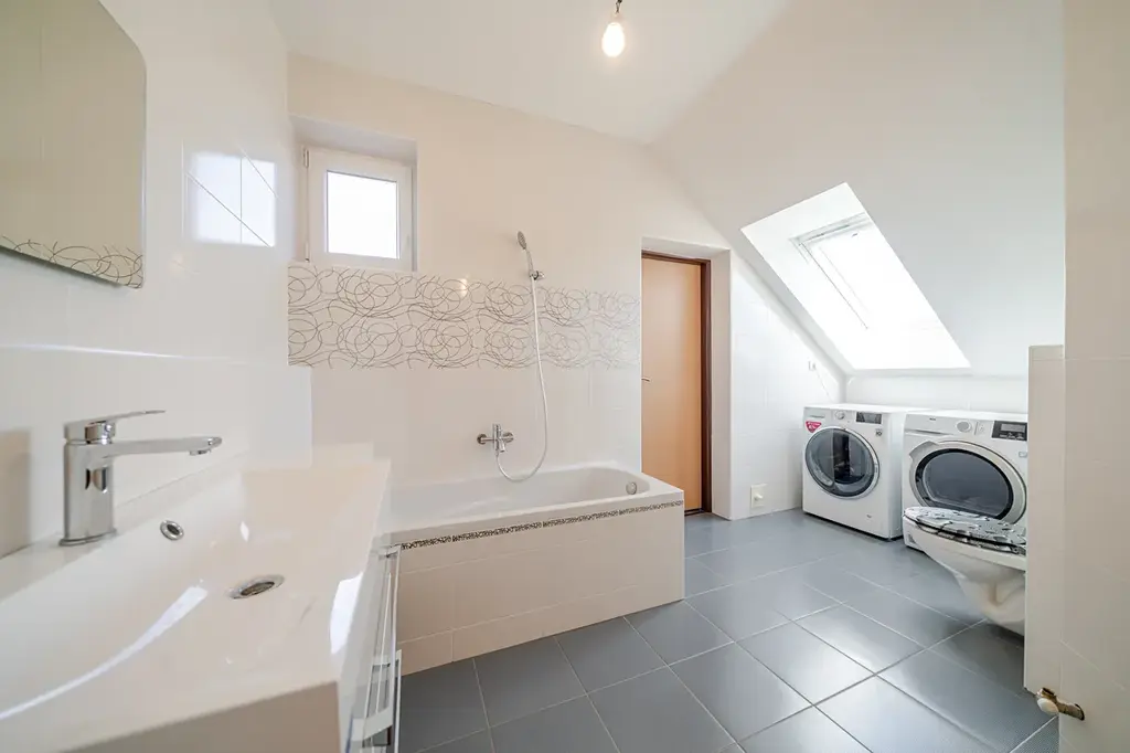 Při vstupu do domu se otevírá prostor zádveří se vstupem do prostorné garáže, do chodby, ve které je technické zázemí a je průchozí do prostor za domem, a třetími dveřmi do bytu.