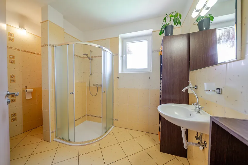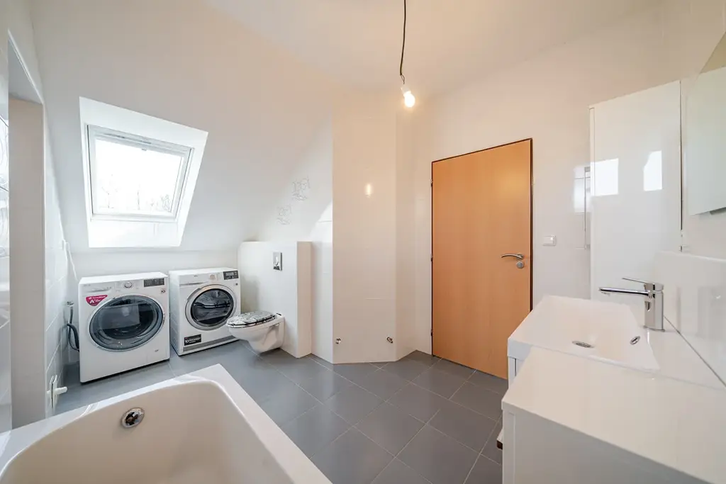 Dominantou přízemí je krásné schodiště vedoucí do patra, kde jsou tři obytné pokoje, dva z nich mají přímý vstup na slunnou terasu, dva pokoje na západ mají střešní okna, stíněná vnitřními i venkovními roletami, vytápění je zajištěno radiátory. Dále je na patře velká koupelna s vanou, umyvadlem a toaletou, je zde přípojka na pračku, topení podlahové, přípojka na topný žebřík, střešní okno. Z koupelny je vchod na prostornou, zateplenou půdu, která se dá využít jako šatna, sklad či letní byt, v přední části je radiátor a střešní okno.