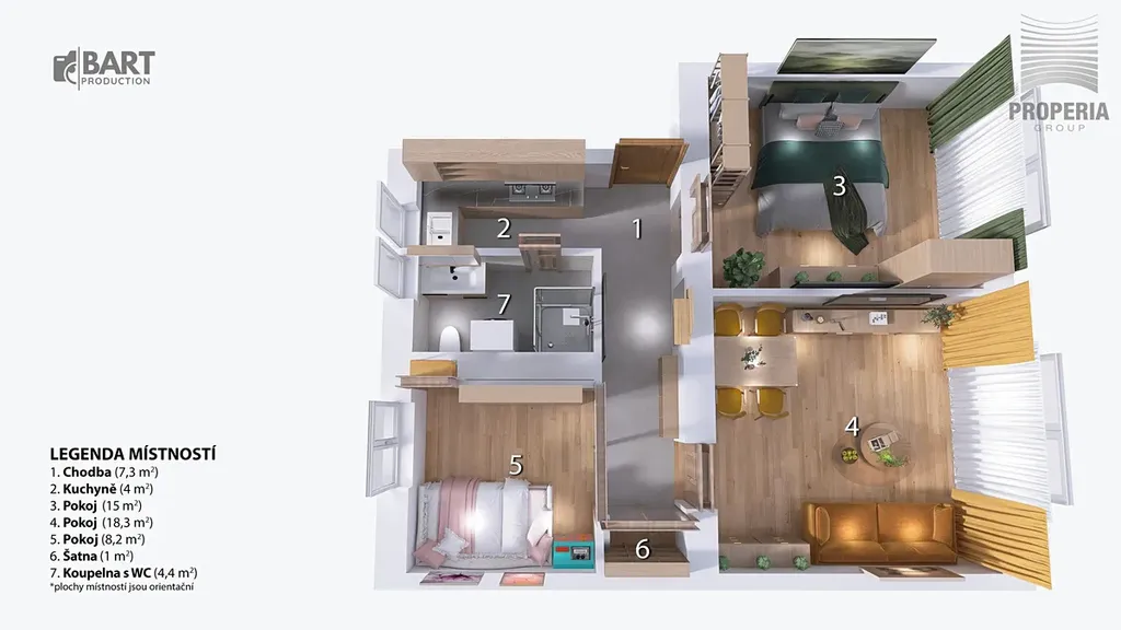 Byt nabízí praktickou dispozici se samostatnou kuchyní, prostorným obývacím pokojem, ložnicí, dalším pokojem vhodným jako dětský pokoj nebo pracovna, koupelnou s WC, chodbou a šatnou. Díky orientaci a velikosti oken je byt velmi světlý a působí vzdušně a příjemně. Byt je nabízen jako částečně vybavený v rozsahu patrném z virtuální prohlídky.