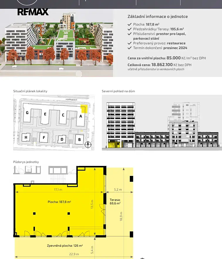 Nabízené prostory mají plochu od 188 m2 a 103 m2 s využitelností pro gastro, showroom / prodejnu nebo služby. Všechny prostory jsou umístěny v přízemí bytových domů s orientací směrem do ulice. Nabídka ve stavu SHELL & CORE umožnuje přizpůsobení prostor potřebám budoucího nájemce, ev. je možná dohoda na dokončení ze strany pronajímatele.
