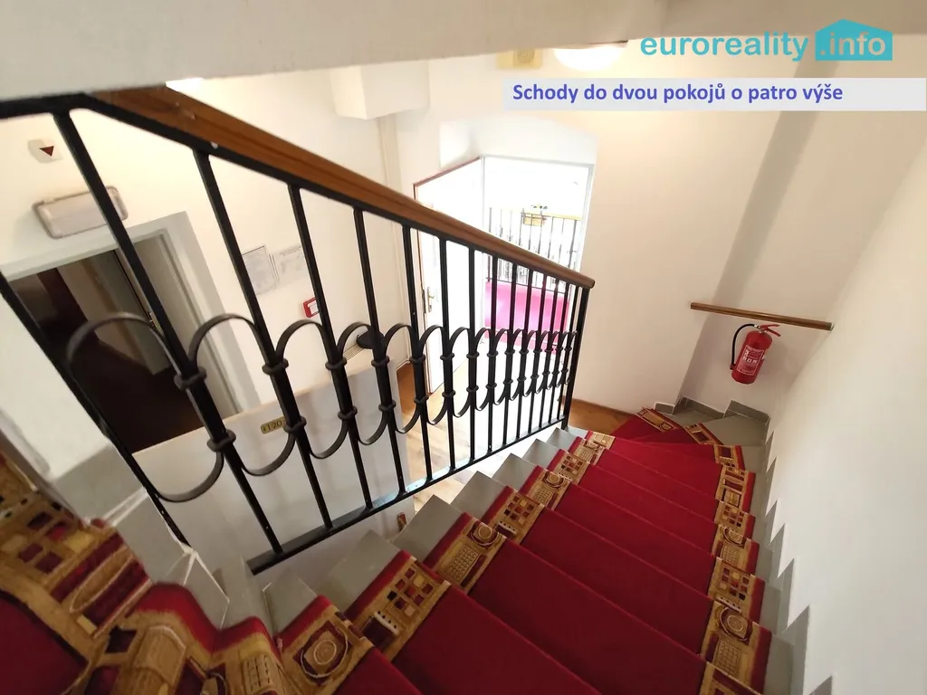 Pokoje jsou ve dvou úrovních. Ve spodní úrovni je jeden pokoj a kuchyně s výstupem do na balkon se schody do klidného vnitrobloku.