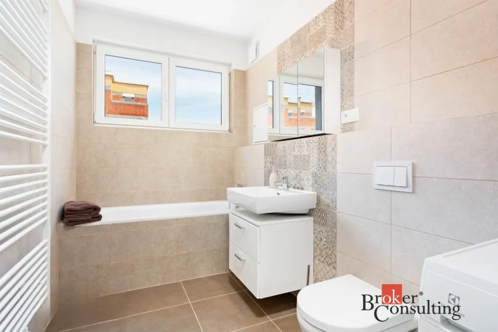 Koupelna je vybavena také pračkou se sušičkou.