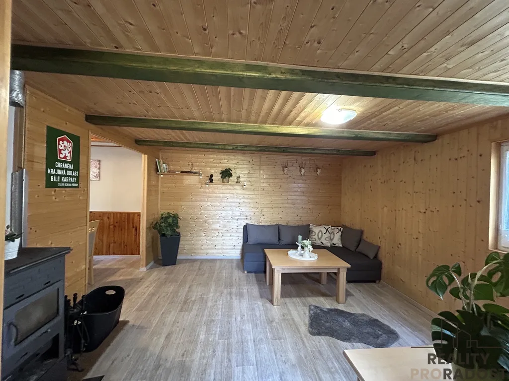 1 patro vám nabídne koupelnu s toaletou, kuchyň, prostorný obývací pokoj s kamny a jídelnu.