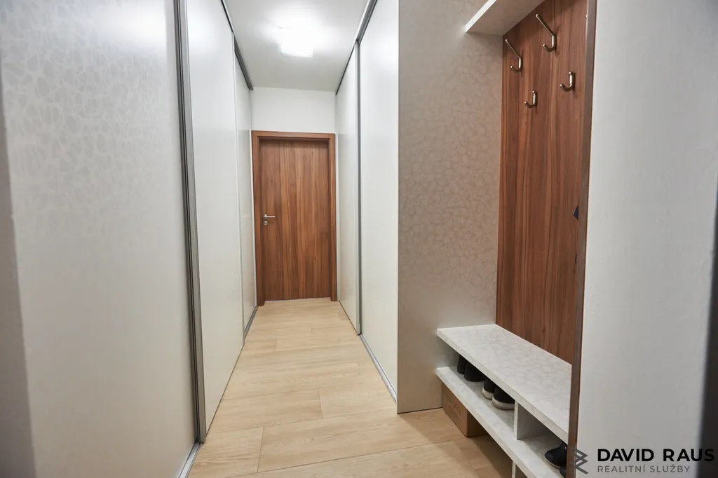 Zařízení celého bytu je v moderním designu, dřevěný dekor podlahy v obytných místnostech se skvěle doplňuje s nábytkem, celý prostor tak působí vzdušně a útulně. Bílá kuchyňská linka dokonale ladí s celým interiérem