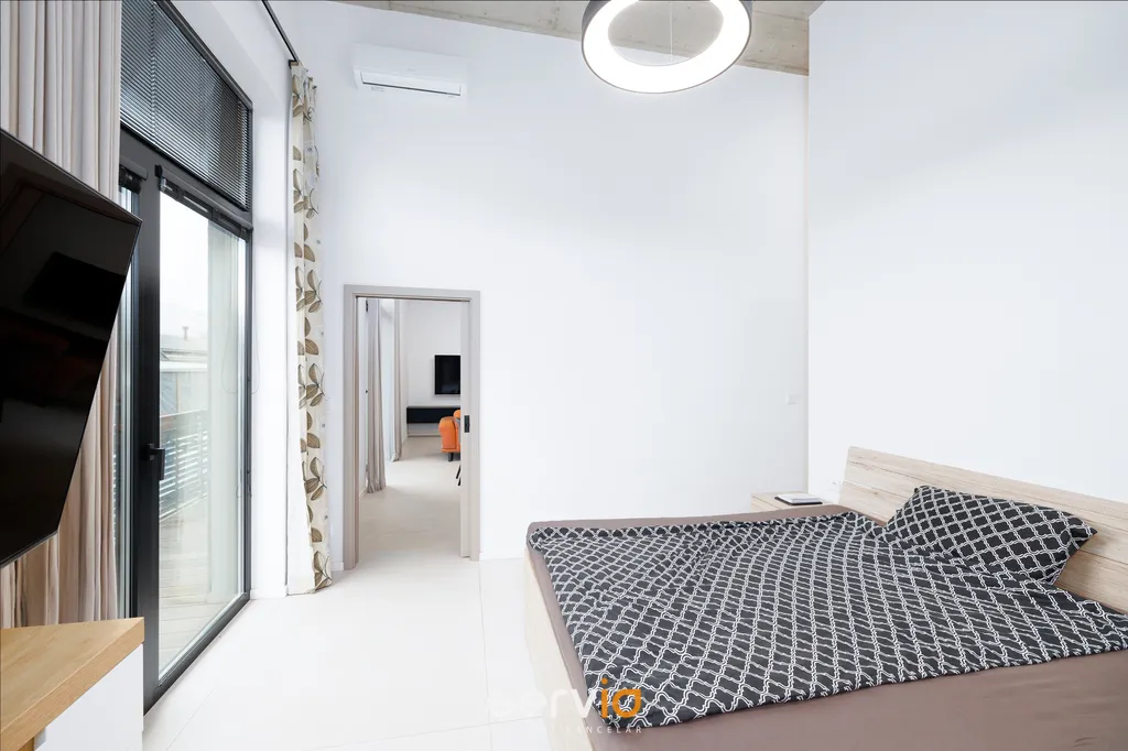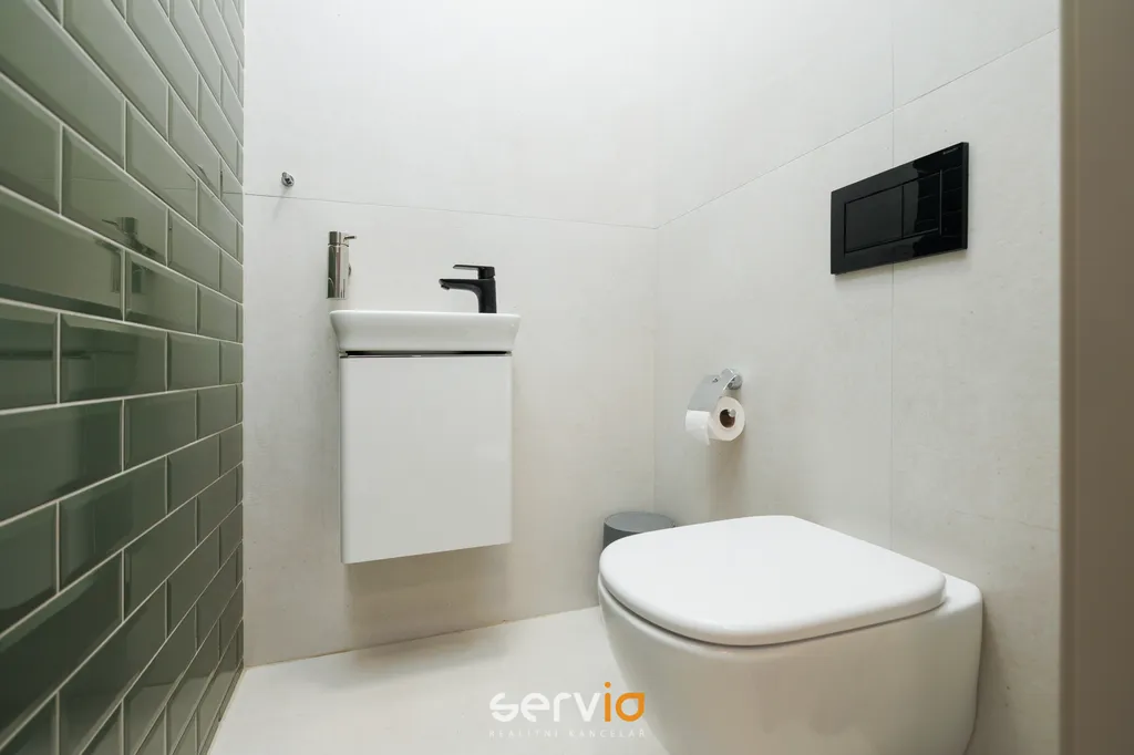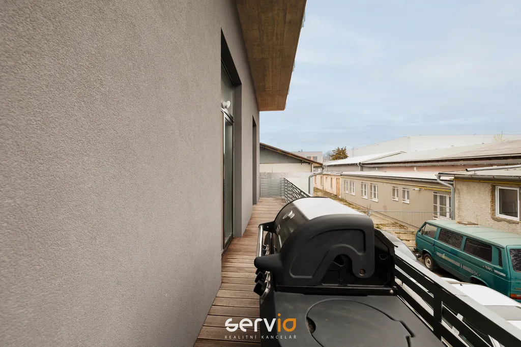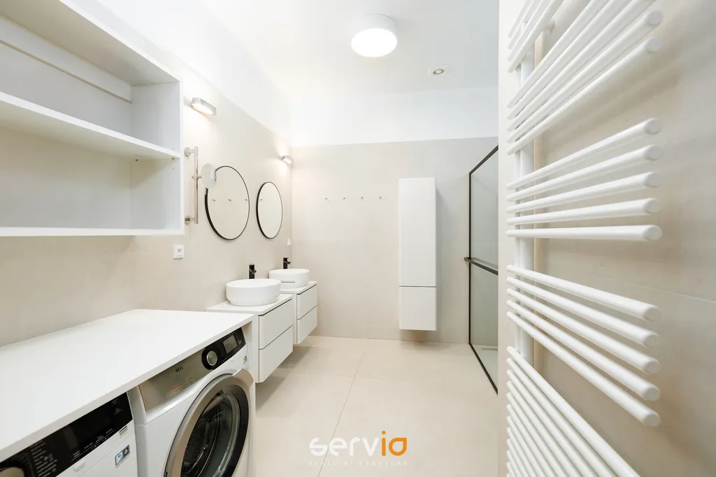 Nadstandardně vybavený byt se nachází v 1PP a skládá se ze 2 neprůchozích pokojů, obývacího pokoje s kuchyní plně vybavenou spotřebiči Siemens, prostorné koupelny se sprchovým koutem, pračkou a sušičkou, samostatného WC, šatny a terasy (18 m2) se třemi samostatnými vstupy.