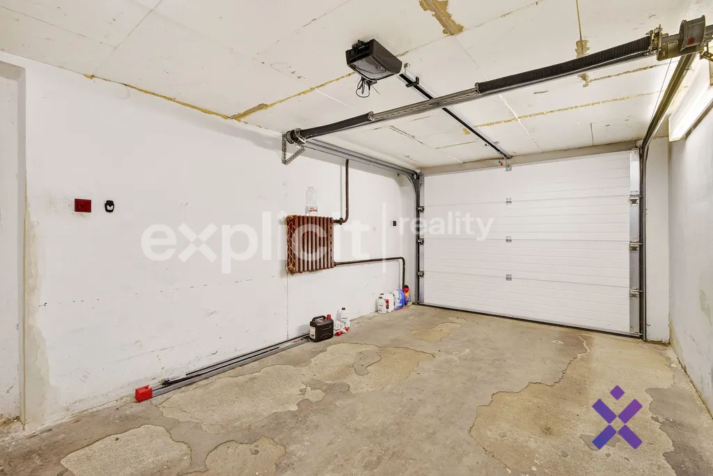 Suterén o velikosti přibližně 70 m² zahrnuje sklepní prostory i garáž přístupnou přímo z domu. Do zahrady lze vstoupit z obou stran domu. Z jedné strany je široká dvoukřídlá brána, druhá strana nabízí pěší průchod kolem domu.