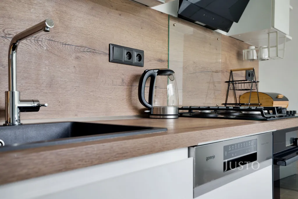 Kuchyňská linka je vybavena vestavěnými spotřebiči – lednicí s mrazákem, myčkou nádobí, mikrovlnnou troubou, plynovou varnou deskou a horkovzdušnou troubou s digestoří.
