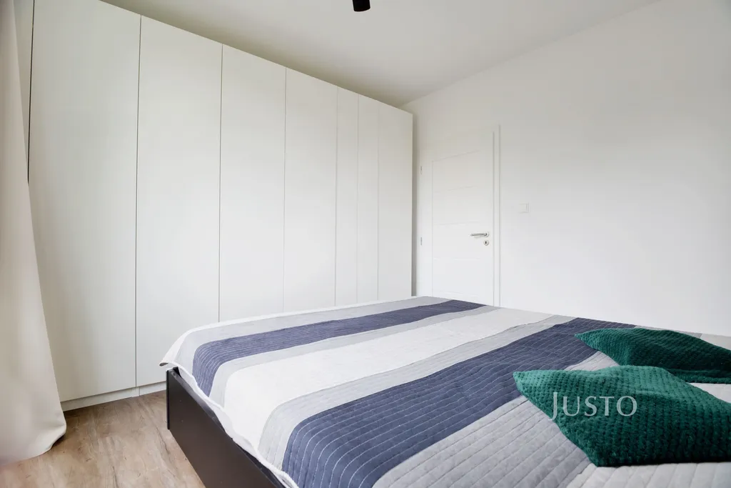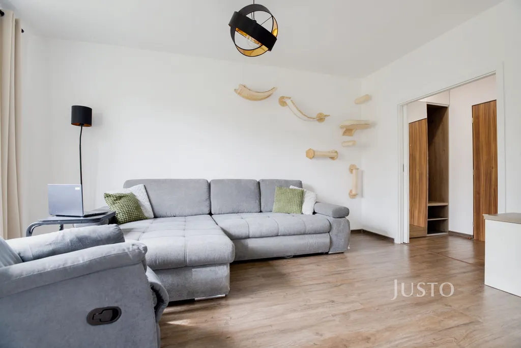 Dominantou bytu je prostorný obývací pokoj, jehož součástí je na míru vyrobená obývací skříň, která je zahrnuta v ceně. Na obytný prostor plynule navazuje moderní kuchyňská linka na míru s ostrůvkem, plně vybavená vestavěnými spotřebiči.