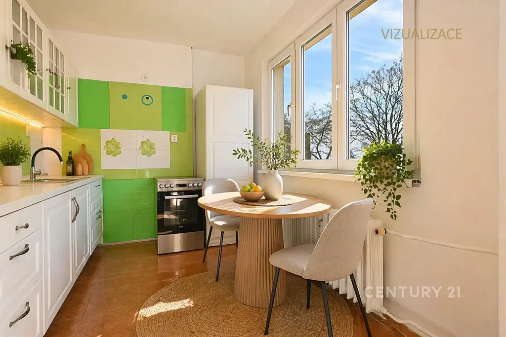 • V kuchyni se nachází kuchyňská linka s elektrickým sporákem, stůl a židle