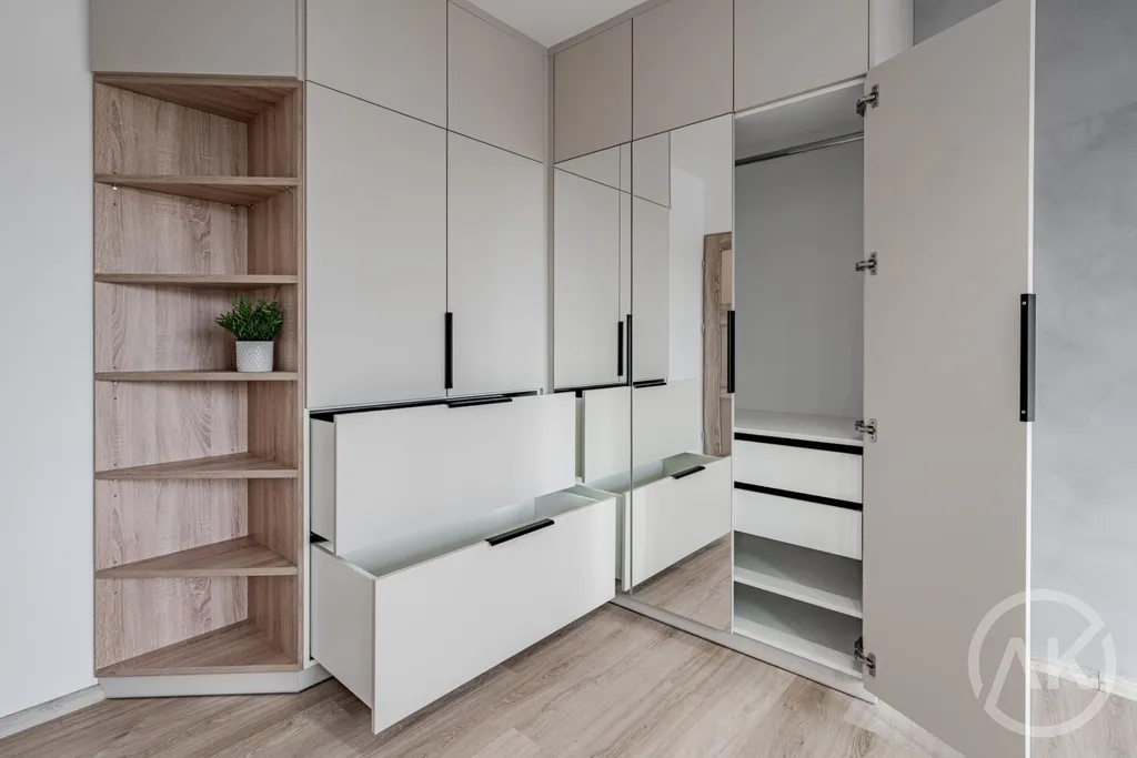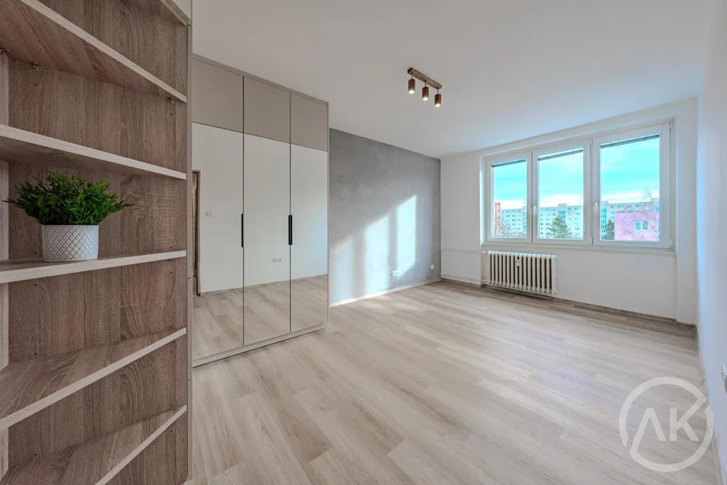 Byt má ložnici a obývací pokoj, což poskytuje dostatek prostoru pro pohodlný život. Také tady najdete komoru a vestavěné skříně, což umožňuje efektivní uspořádání prostoru a ukládání osobních věcí.
