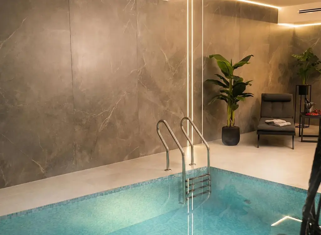 - hlavní relaxační prostor s bazénem, posezením, lehátky a kuchyňským koutem s barovou zónou,