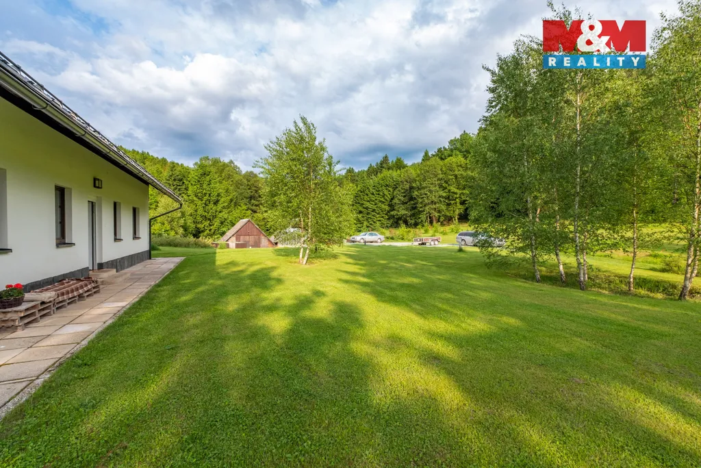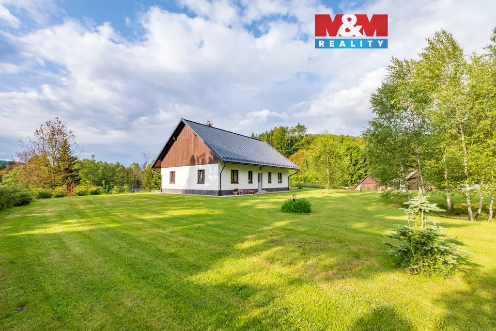 Prodej unikátní novostavby z roku 2022 s rozsáhlým oploceným pozemkem 8649 m², včetně dalších čtyř stavebních parcel (1253 m², 1107 m², 1192 m² a 782 m²) v lokalitě Čížkův mlýn, Nový Hrádek - Rzy. Dům o obytné ploše 110 m² v podhorském stylu stojí na vyvýšeném souboru parcel, oddělených lesem a terénem pro maximální soukromí. Součástí je dílna a 2 chatky. Přístup z obecní cesty (150 m od asfaltové silnice), pozemkem vede vlastní zpevněná cesta. Dům má 2 ložnice, obývací pokoj s HS portálem a nádherným výhledem, pracovnu, jídelnu, kuchyň, technickou místnost s WC a koupelnu s vanou i sprchou. Je postaven z nadstandardních materiálů, cihly s vnitřní izolací, VPC tvárnice, betonové stropy, masivní dubové podlahy a lakovaná hliníková střecha. Vytápění a ohřev vody zajišťuje úsporné tepelné čerpadlo. Připravená možnost rozšíření o velkorysé podkroví s vestavbou schodiště místo pracovny. Voda z vlastní studny. Ideální pro trvalé bydlení i rekreaci v jedinečné lokalitě obklopené přírodou.