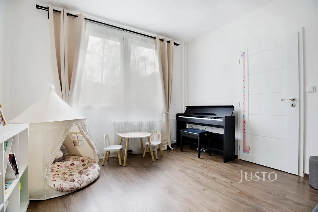 Byt dále nabízí ložnici, dětský pokoj, koupelnu s vanou, samostatnou toaletu a prostornou vstupní chodbu s dostatkem místa pro úložné řešení. Součástí bytu je také praktická komora.