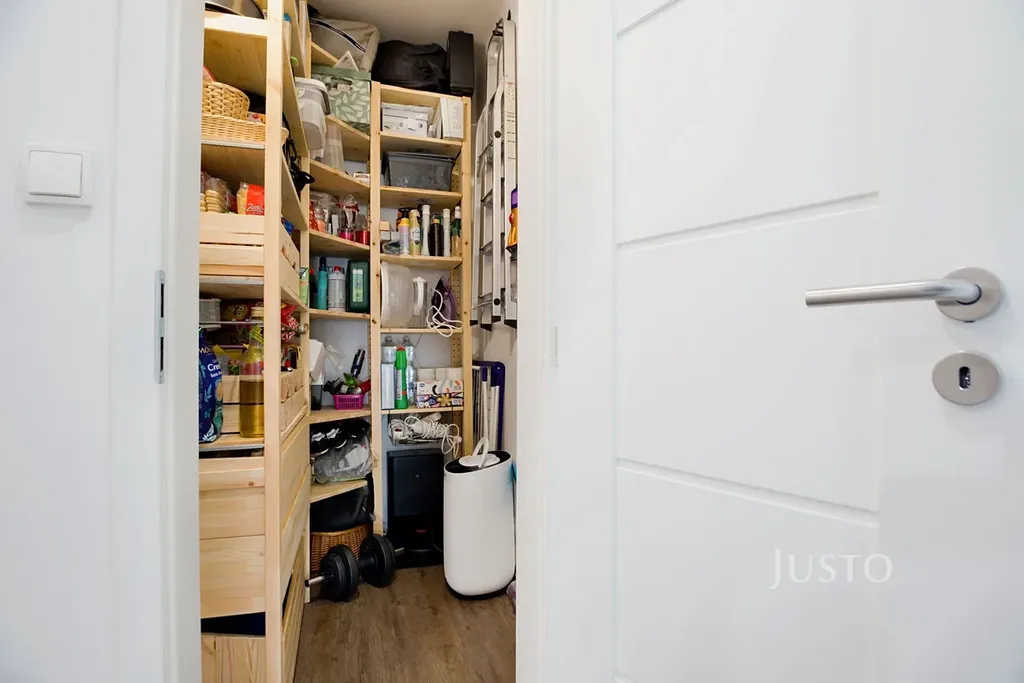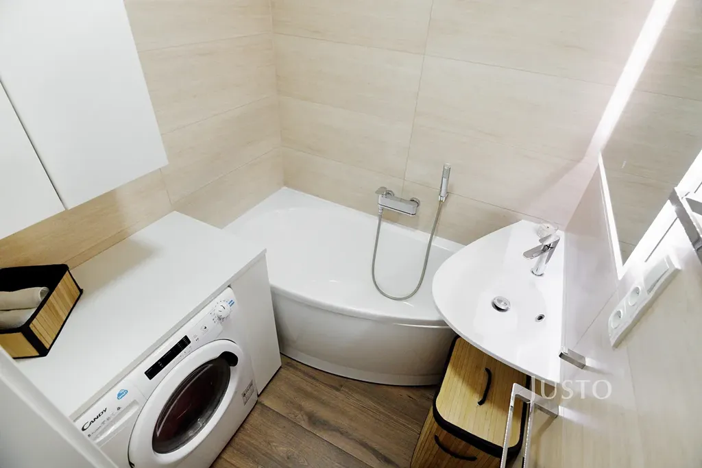 Dominantou bytu je prostorný obývací pokoj, jehož součástí je na míru vyrobená obývací skříň, která je zahrnuta v ceně. Na obytný prostor plynule navazuje moderní kuchyňská linka na míru s ostrůvkem, plně vybavená vestavěnými spotřebiči.