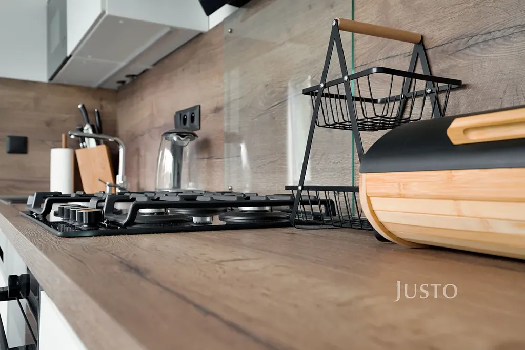Kuchyňská linka je vybavena vestavěnými spotřebiči – lednicí s mrazákem, myčkou nádobí, mikrovlnnou troubou, plynovou varnou deskou a horkovzdušnou troubou s digestoří.