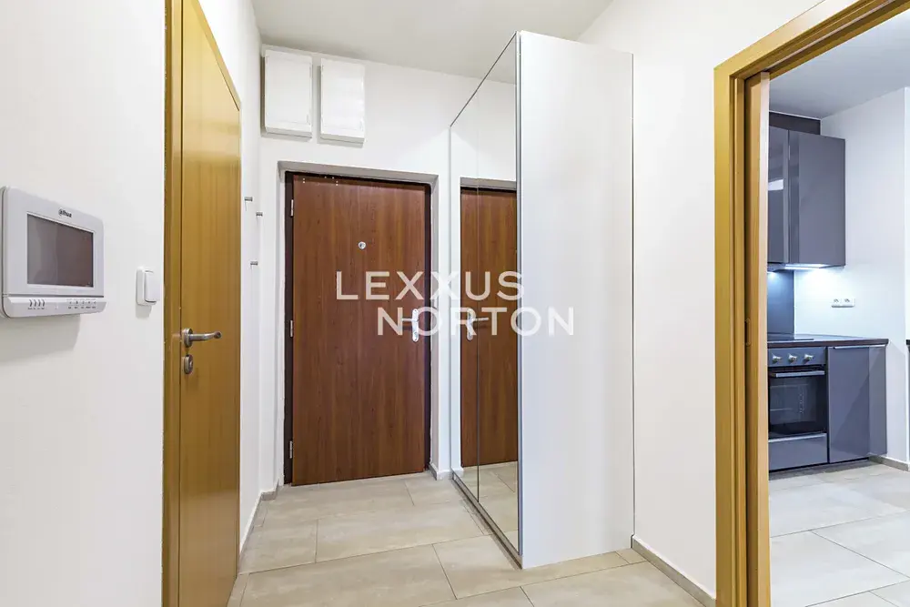 Vstupní chodba disponuje šatní skříní, kuchyň je plně vybavená sklokeramickou varnou deskou, troubou, lednicí, mrazákem, mikrovlnnou troubou a myčkou nádobí. V ložnici se nachází šatní skříně a koupelna disponuje sprchovým koutem a toaletou. K bytu náleží rozlehlá terasa se zahradním nábytkem.