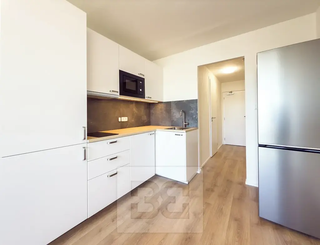 Byt je vybaven moderní prostornou kuchyňskou linkou se spotřebiči (lednice s mrazákem, indukční deska, mikrovlná trouba, digestoř a pračka).