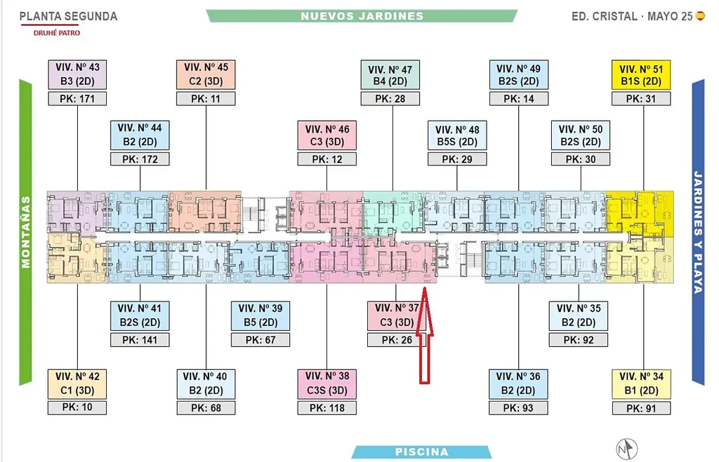 Apartmán s označením SPVCR1_37 se nachází ve druhém patře. Jedná se o tříložnicový apartmán se dvěma koupelnami, kuchyňským koutem, obývacím pokojem a terasou 25 m2. Užitná plocha je 75,7 m2, celková plocha včetně terasy 103,6 m2. K apartmánu náleží parkovací stání číslo 26 v podzemních garážích.