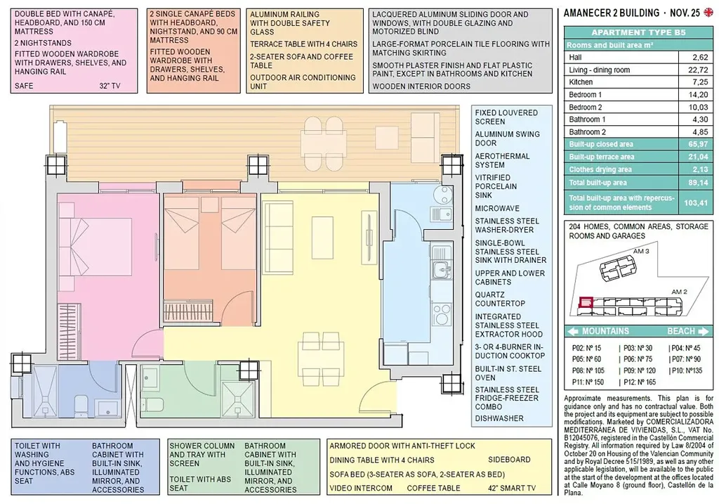 Apartmán SPVAM2_30 se nachází v devátém patře. Má obytnou plochu 66 m² a je rozdělaný do dvou ložnic, dvou koupelen, prostorného obývacího pokoje s jídelnou a otevřenou kuchyní a terasy 21 m2. Celková plocha je tedy 89 m2. Kromě toho se prodává částečně zařízený a plně vybavený, s klimatizací a parkovacím místem #B36 v ceně.