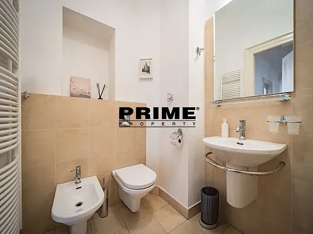Dispozice: prostorná centrální předsíň, pět místností, plně vybavená kuchyň se spotřebiči (sklokeramická varná deska, trouba, myčka, lednice s mrazákem a mikrovlnná trouba), dvě koupelny (sprchový kout a toaleta + vana, toaleta a bidet), dvě šatny, samostatné WC a malý balkon.